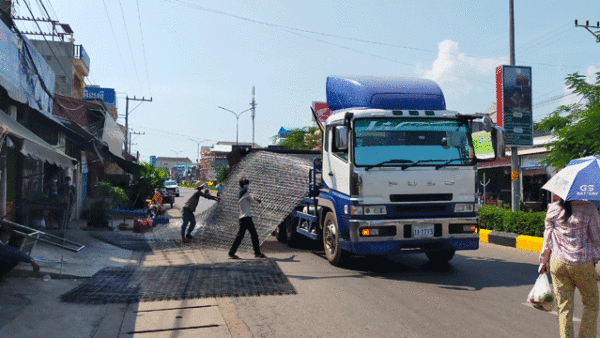 រថយន្តយីឌុបដឹកផ្ទាំងដែកក្រឡាសំណាញ់ មិនចងរឹតឱ្យបានល្អ រមៀលផ្អៀង ក្រឡាប់ក្បែរវិមានឯករាជ្យ សំណាងល្អមិនប៉ះចំមនុស្សធ្វើដំណើរតាមដងផ្លូវ