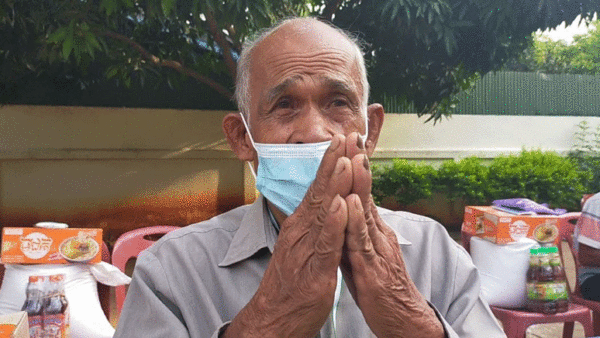 លោកតាចំណាស់ម្នាក់ អង្គុយហូរទឹកភ្នែករហាម ត្រេកអរខ្លាំង អារម្មណ៍ក្តុកក្តួល ខណ:ដែលទទួលបានអំណោយពីសម្តេចតេជោ និងប្រាក់មូលនិធិ (ឧបត្ថម្ភ) ពីអភិបាលខេត្តប៉ៃលិន