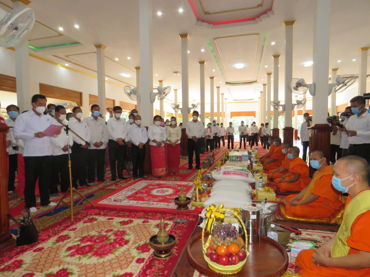 បន្ទាប់ពី ព្រះសីលសំវរ ប៊ត តាំង ឆេង ព្រះមេគណខេត្ត និងព្រះសង្ឃ ៧ អង្គ បាន សូត្រពុទ្ធជ័យមង្គល ចម្រើនព្រះបរិត្តទៅតាមទំនៀមទំលាប់ប្រពៃណីយសាសនា រួចមក ឯកឧត្តម អ៊ុនចាន់ដា និងលោកជំទាវ ព្រមទាំង ថ្នាក់ដឹកនាំ បានអញ្ជើញ វេរភត្តហារ ប្រគេនព្រះសង្ឃចំនួន ៧អង្គ នូវចង្ហាន់ ផ្លែឈើ សាដក និងបច្ច័យចំនួន ៥ម៉ឺនរៀល ដោយឡែក ព្រះចៅអធិការវត្ត បច្ច័យ ២០ម៉ឺនរៀល ។ ឧបត្ថម្ភ យុវជនកាកបាទក្រហមកម្ពុជា ១១នាក់ និងចាស់ព្រឹទ្ធាចារ្យ ចំនួន ៨៦ នាក់ ម្នាក់ៗ ថវិកា ២០,០០០រៀល។