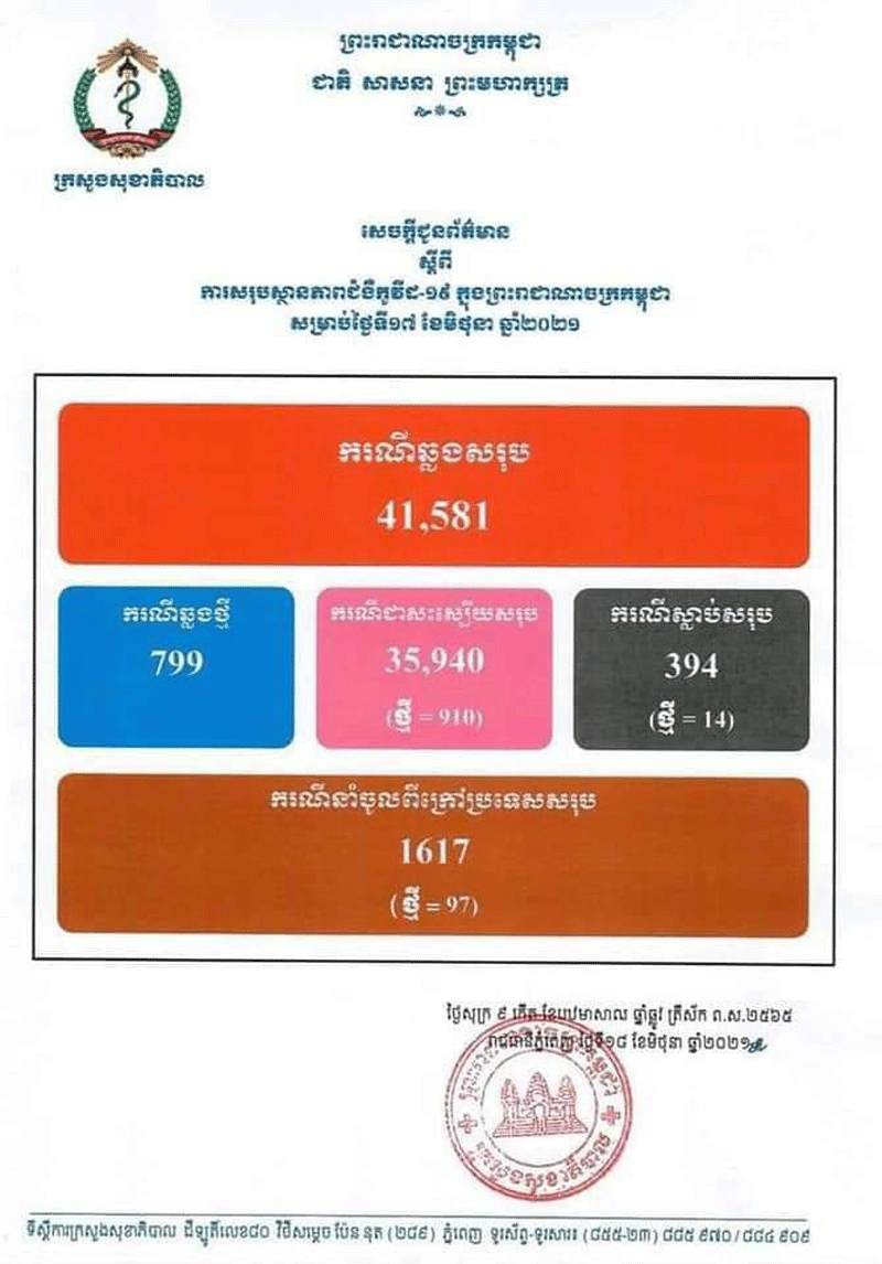 ខេត្តស្វាយរៀង៖រដ្ឋបាលខេត្តស្វាយរៀងពិតជាមានក្តីរន្ធត់ និងសោកស្តាយដោយបានទទួល ព័ត៌មានអំពីការស្លាប់របស់អ្នកមានវិជ្ជមានកូវីដ-១៩ ចំនួន ០២នាក់ កាលពីថ្ងៃទី១៧ ខែមិថុនា ឆ្នាំ២០២១ បានបង្ហាញយ៉ាងច្បាស់លាស់ពីហានិភ័យដ៏កាច សាហាវដល់អាយុជីវិតបងប្អូន ប្រជាពលរដ្ឋខេត្តស្វាយរៀងក៏ដូចមនុស្សទូទៅក្នុងព្រះរាជាណាចក្រកម្ពុជាផងដែរ ។ យើងខ្ញុំសូមចូលរួមរំលែកទុក្ខជាមួយក្រុមគ្រួសារ ចំពោះការបាត់បង់សាច់ញាតិជា ទីគោរពស្រឡាញ់ និងសូមបួងសួងដួងវិញ្ញាណក្ខន្ធដែលបានស្លាប់ បាត់បង់ដោយសារ ជំងឺកូវីដ-១៩ឆាប់បានចាប់បដិសន្ធិក្នុងសុគតិភពកុំបីឃ្លៀងឃ្លាតឡើយ។ ករណីទី១.ទទួលមរណភាពដោយសារជំងឺកូវីដ-១៩មុនពេលចូលសម្រាកព្យបាលមានឈ្មោះ ធន់ សាខន អាយុ ៥៩ឆ្នាំ រស់នៅភូមិ មេលោង សង្កាត់ ចេក ក្រុង ស្វាយរៀង ខេត្តស្វាយរៀងកាលពីថ្ងៃទី១៦ខែមិថុនាឆ្នាំ២០២១នៅវេលាម៉ោង១២ៈ៣០នាទីក្រុមការងារស្រាវជ្រាវនិងតាមដានបុគ្គលសង្ស័យថាមានផ្ទុកជំងឺកូវី-១៩ខេត្តបានសហការជាមួយក្រុមឆ្លើយតបបន្ទាន់បានធ្វើកោសល្យវិច្ឆ័យយកវត្ថុវិភាគសំណាកតាមរយះធ្វើតេស្តរហ័សលទ្ធផលវិជ្ជមានកូវីដ-១៩។តាមការសន្និដ្ឋានរបសក្រុមគ្រូពេទ្យ៖បុរសខាងលើទទួលមរណភាពដោយសារ ជំងឺរ៉ាំរ៉ៃ លើសឈាម ទឹកនោមផ្អែម និងមានជំងឺកូវីដ-១៩។